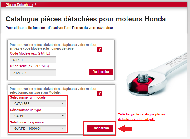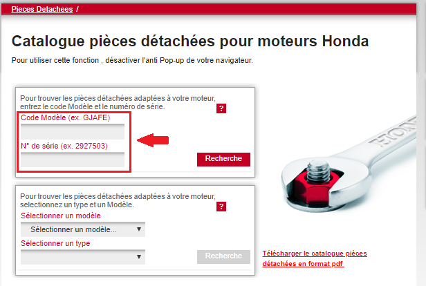 Entrez le code modèle ainsi que le numéro de série de votre moteur dans l'espace réservé puis cliquez sur "Recherche".