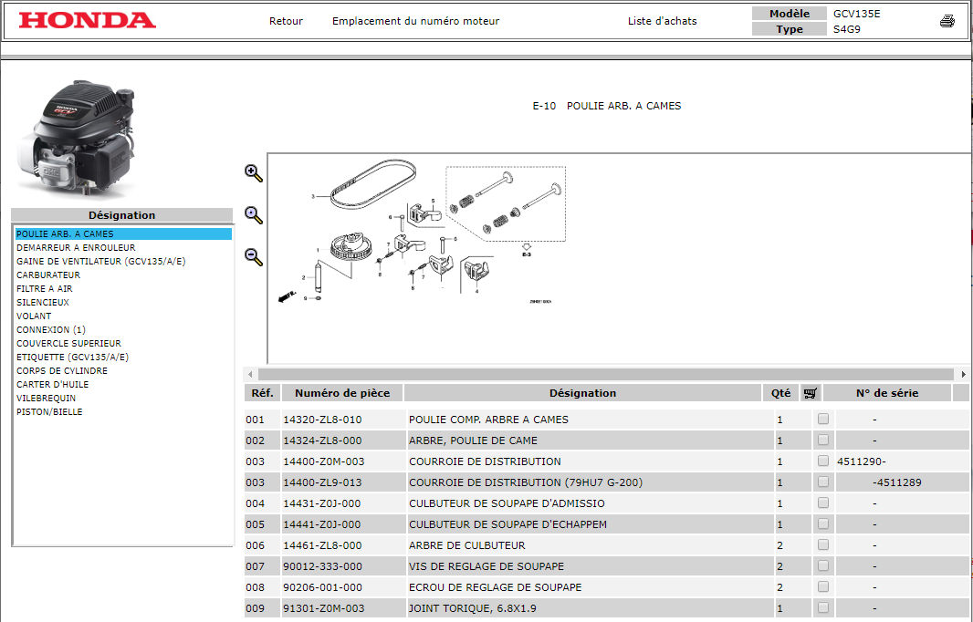 Vous avez alors accèes aux références des différentes pièces moteur.