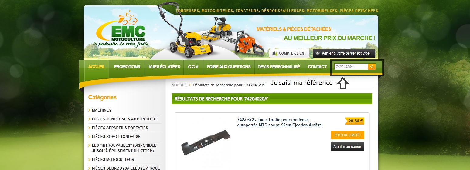 ENSUITE VOUS POUVEZ CONSULTER LE TARIF ET LA DISPONIBILITÉ DES PIÈCES SUR LE SITE WWW.EMC-MOTOCULTURE.COM EN SAISISSANT CHAQUE RÉFÉRENCE (NE PAS SAISIR DE TIRETS NI D'ESPACES )DANS LE MOTEUR DE RECHERCHE, COMME SUIT :